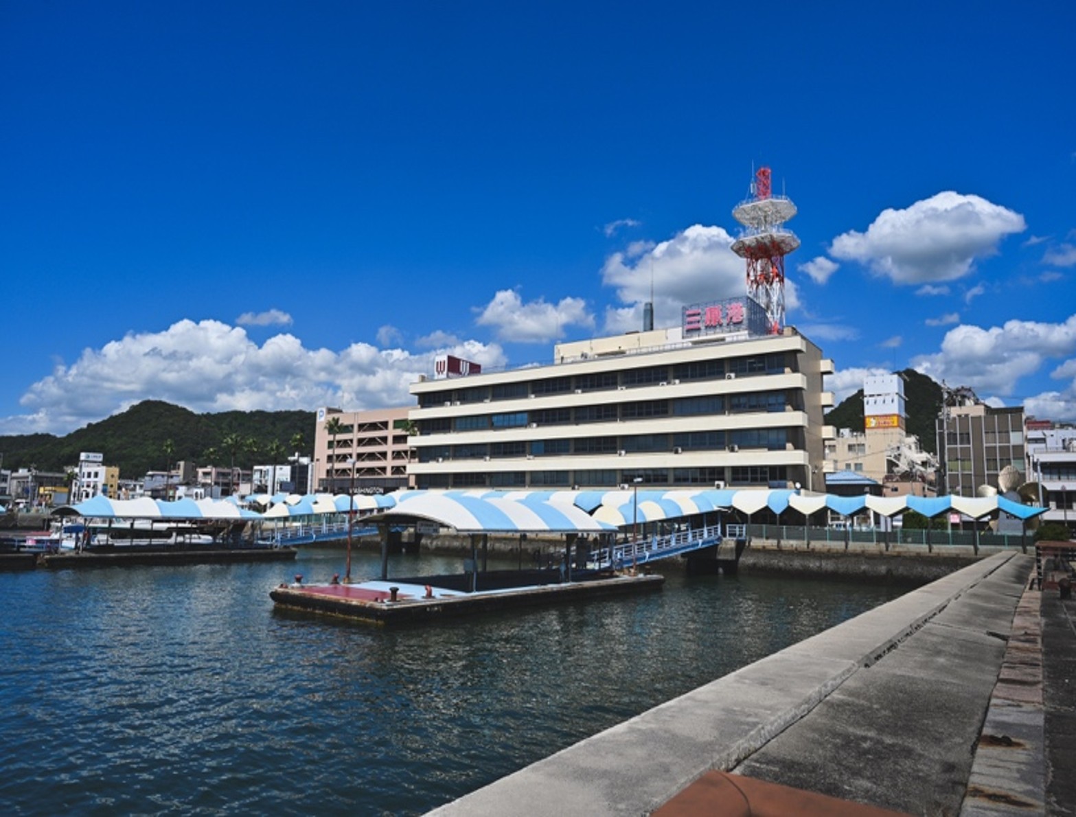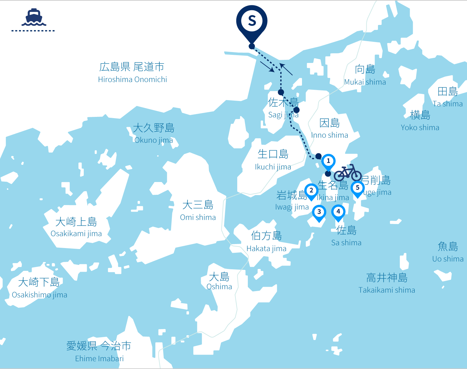 このモデルコースのスタート地点、新幹線も停まるJR三原駅から徒歩5分の三原港フェリー乗り場です。土生商船の高速船「因島 ・生名島・佐木島・ 三原」に乗船します。マイバイクの方は自転車を積載し、レンタサイクルの方は、あらかじめ予約して立石港、あるいは満車であれば土生港のレンタサイクルでもOKです!