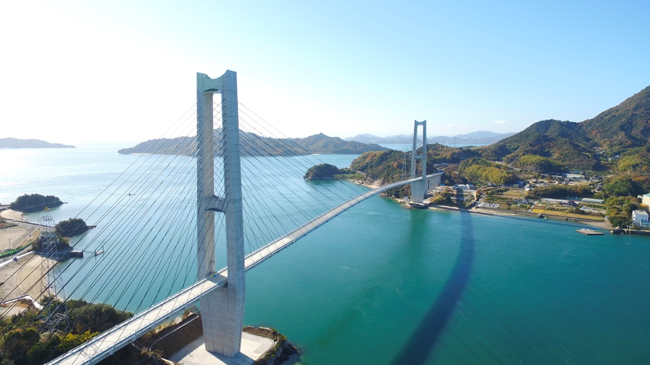 開発が進んでいない、心に描いた瀬戸内に浮かぶ素朴な美しい景色が楽しめるゆめしま海道のこのルートでの入口です。同じ道を通るよりも周遊したほうが楽しいので、西廻りで岩城橋を目指します。2022年に開通したばかりの岩城橋は、船をくぐらせるために真ん中が盛り上がっており、まるで壁に登っているような感覚?絶景が楽しめます。